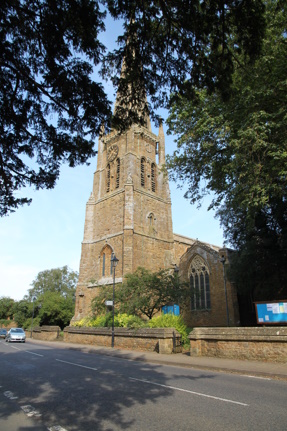 Soon after 1300 the north and south aisles were widened and the shallow north transept was constructed. The last is separated from the north aisle by a striking diamond-shaped pillar from which spring 2 arches. The clustered shaft of the pillar has an elaborately carved capital depicting the heads and shoulders of knights and ladies with linked arms, a feature found in other north Oxfordshire churches and possibly carved by the same mason. The windows in the north wall of the north aisle and those in the south aisle still retain the tracery of this period. The north and south porches are contemporary with the widened aisles. The south porch is vaulted in 2 bays and is surmounted by a parvise, the upper part of which is of later date. The west tower and spire are also of early-14th-century date. The tower is richly ornamented and its west doorway has elaborate mouldings with a pattern of leaves, birds, and ball flower. Round the hood-mould of the door are the 12 apostles seated on thrones and above is portrayed the Last Judgment.